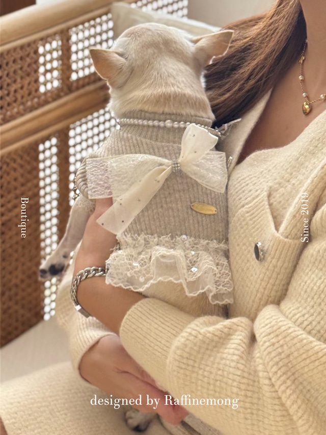 レース部分のスパンコールと華やかなリボンブローチのマッチで